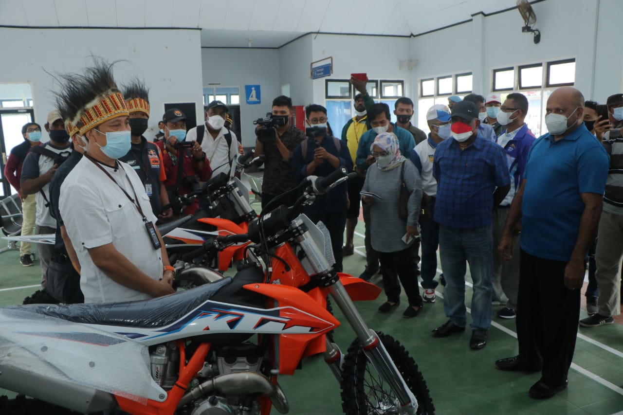 Merauke – Bertempat di Ruang Tunggu Pelabuhan Merauke Kabupaten Merauke, telah dilaksanakan kegiatan penyerahan 74 unit motor (36 unit 125CC dan 38 unit 250CC) secara simbolis untuk menunjang pelaksanaan PON XX Papua cabor Balap Motor dari Vendor KTM kepada Bupati Merauke selaku Ketua Sub PB PON Merauke, Sabtu (18/09).